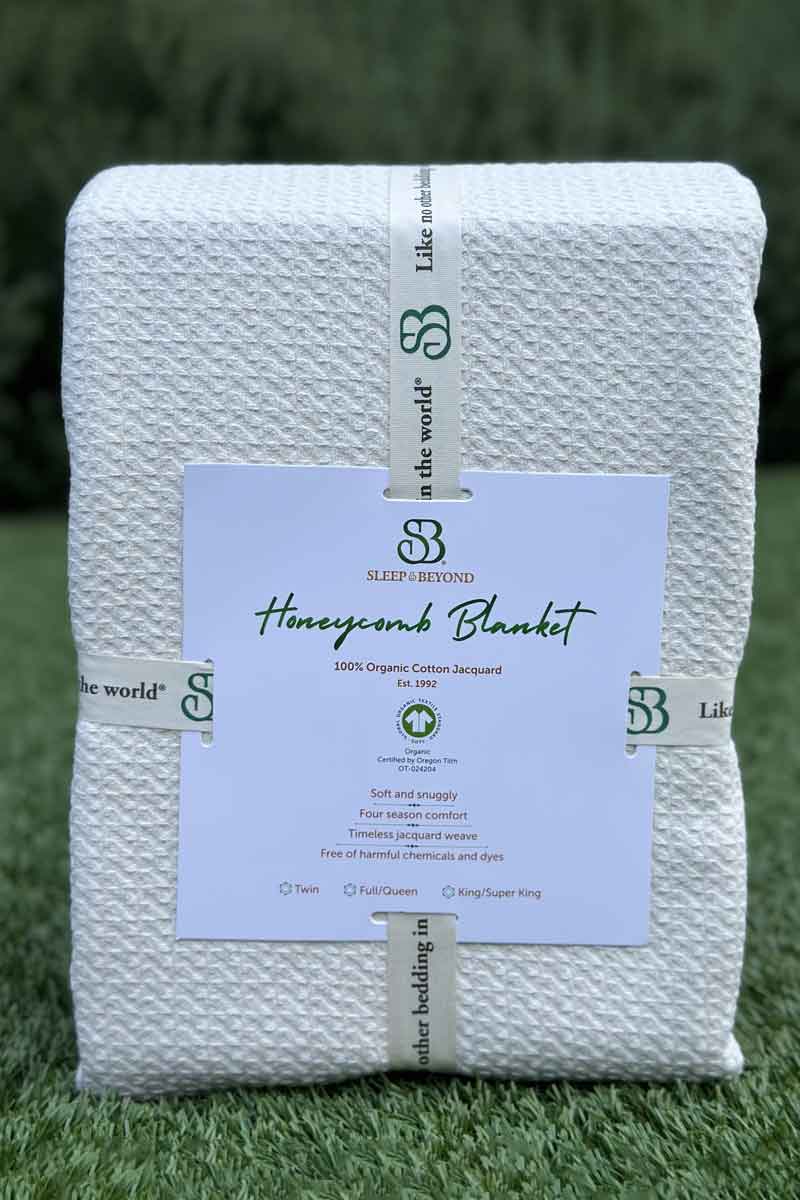 Elevate your everyday comfort with our Organic Cotton Honeycomb Jacquard Blanket—crafted for year-round coziness, exceptional durability, and effortless style. Woven from 100% GOTS-certified organic cotton in a timeless jacquard pattern, this versatile blanket promises breathable comfort, superior airflow, and pure peace of mind.