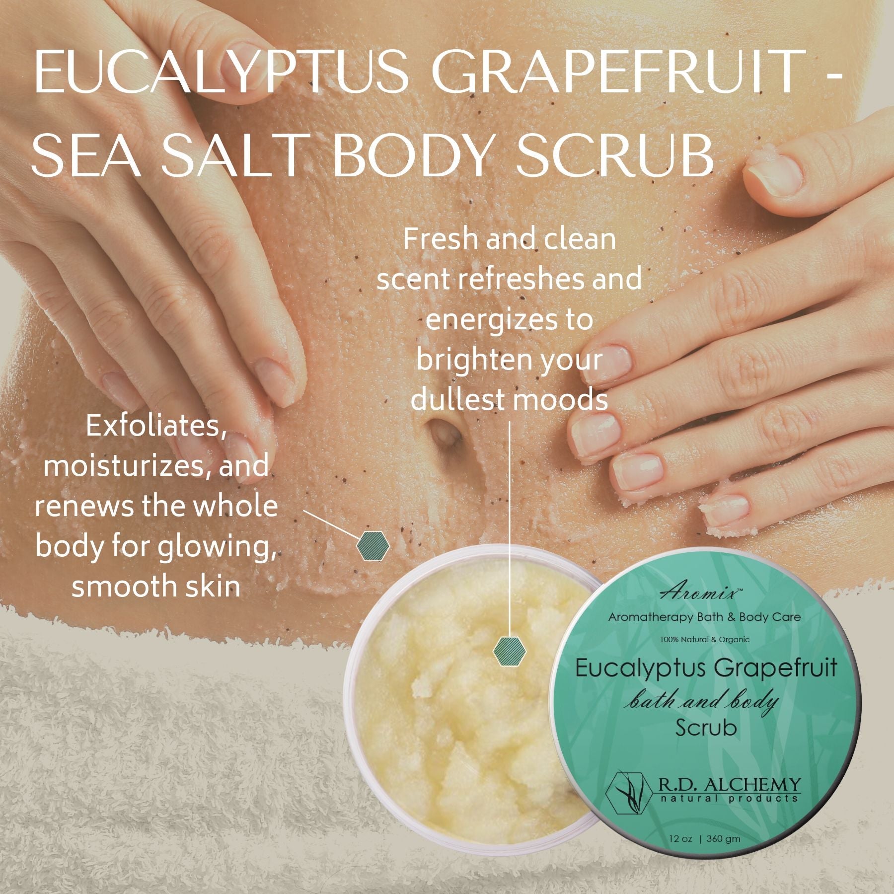 Cleanse and enliven your body, mind and spirit with the fresh, crisp scents of Eucalyptus and Grapefruit aromatherapy essential oils. Clear your mind, uplift and awaken your senses and brighten your dullest moods with this energizing blend.A Sea Salt Body Scrub is something vital and not to be missed in your weekly routine! Weekly full body exfoliation helps reduce body acne, blackheads, stretch marks, flaky patches, ingrown hairs and pigmented blemishes. Transform the driest, dullest skin with our 100% natural, buttery salt scrub. Coconut, Jojoba and Safflower oils moisturize and soften, as 100% pure essential oils invigorate the senses & beautify while fine Sea Salt exfoliates dead skin cells to rejuvenate and renew.