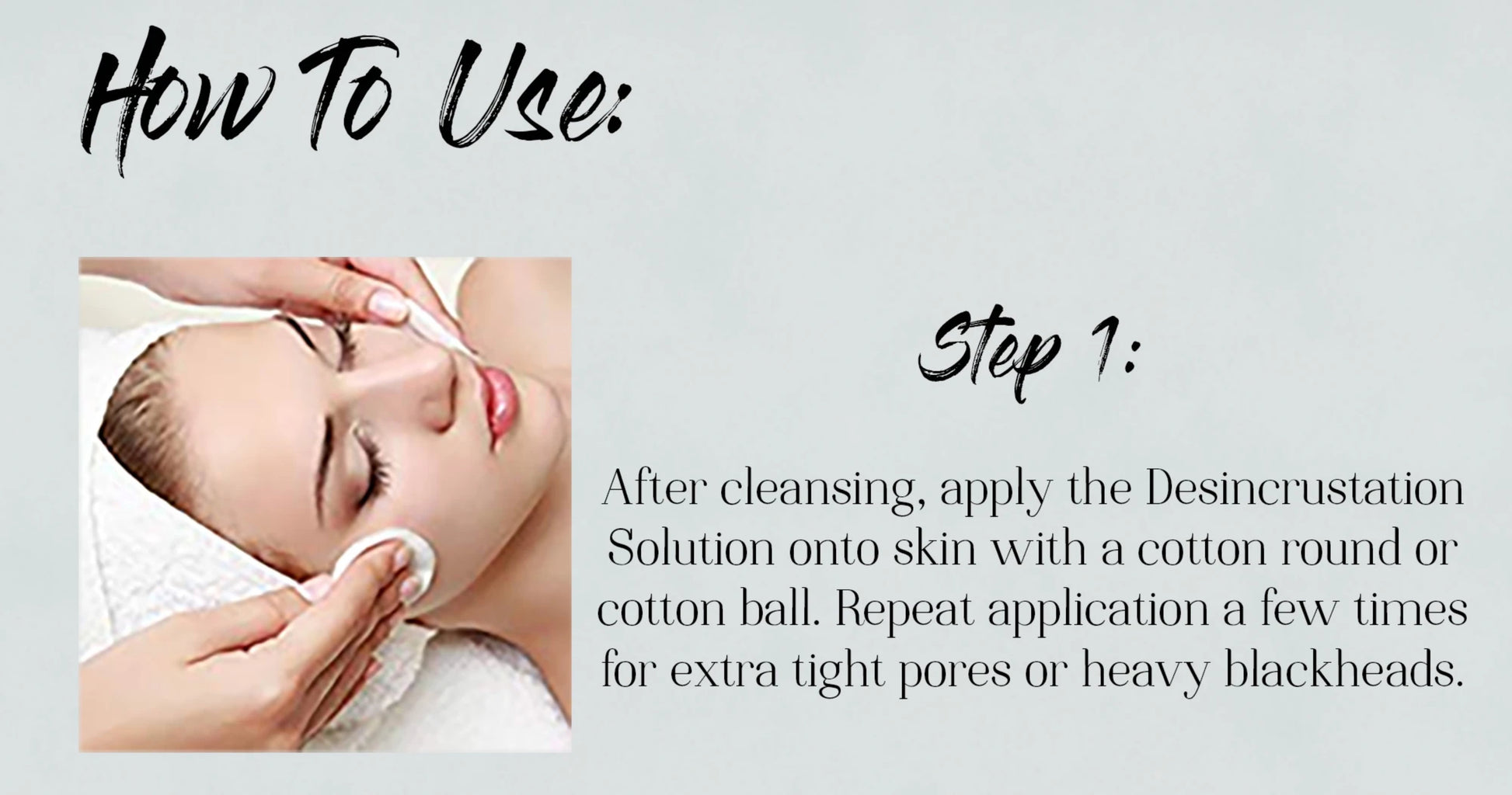 Shake well before use. Saturate a cotton ball or cotton round and apply to face and neck, avoiding eye area. Leave on for 10-15 minutes with or without steam. Rinse well with water and/or toner to neutralize.
