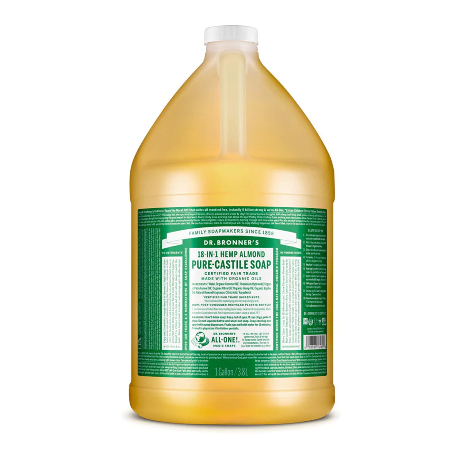 Warm, comforting and slightly sweet—like marzipan or amaretto! Almond Pure-Castile Liquid Soap is concentrated, biodegradable, versatile and effective. Made with organic and certified fair trade ingredients. Organic hemp seed oil is now sourced in the U.S. following hemp legalization! Packaged in a 100% post-consumer recycled bottle. All-One!