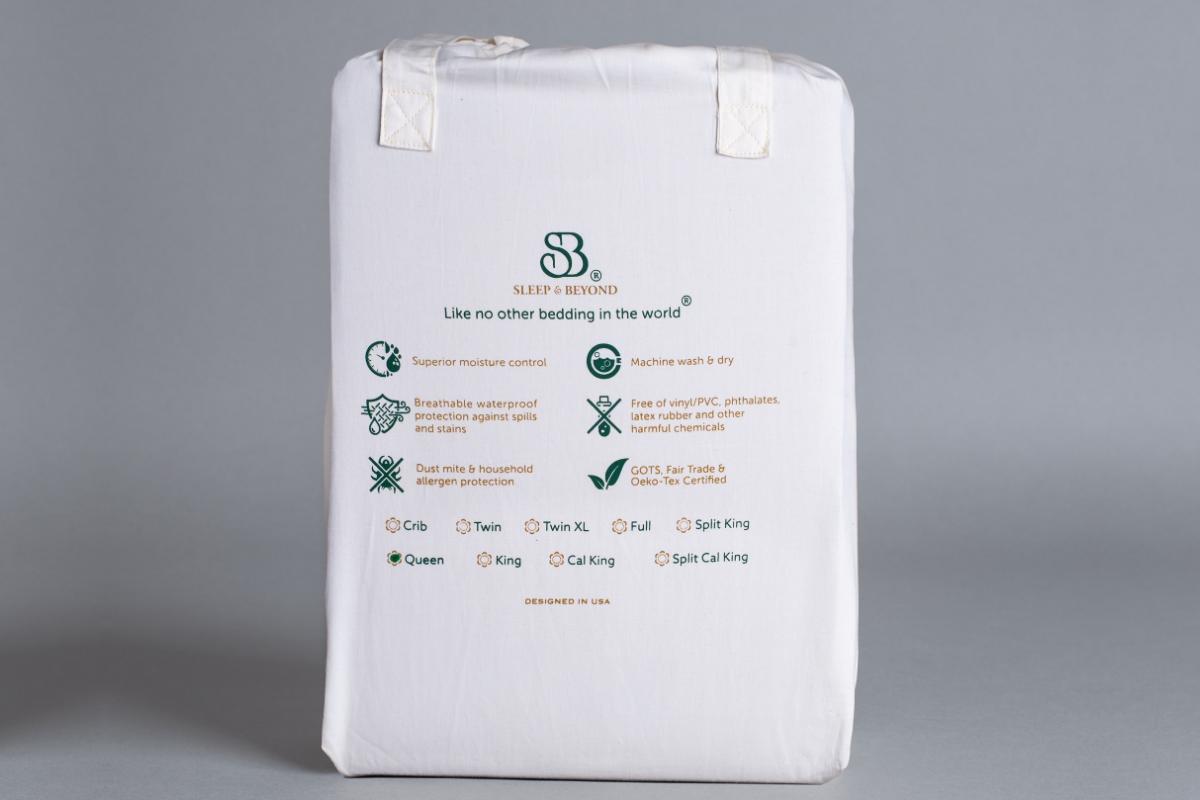 The dual layer of organic jersey cotton between Sleep & Beyond's signature biodegradable Thermoplastic Polyurethane (TPU) coating protects while delivering maximum comfort and flexibility. Unlike many mattress protectors, this barrier extends to all four sides, staving off spills, bacteria, and allergens.
