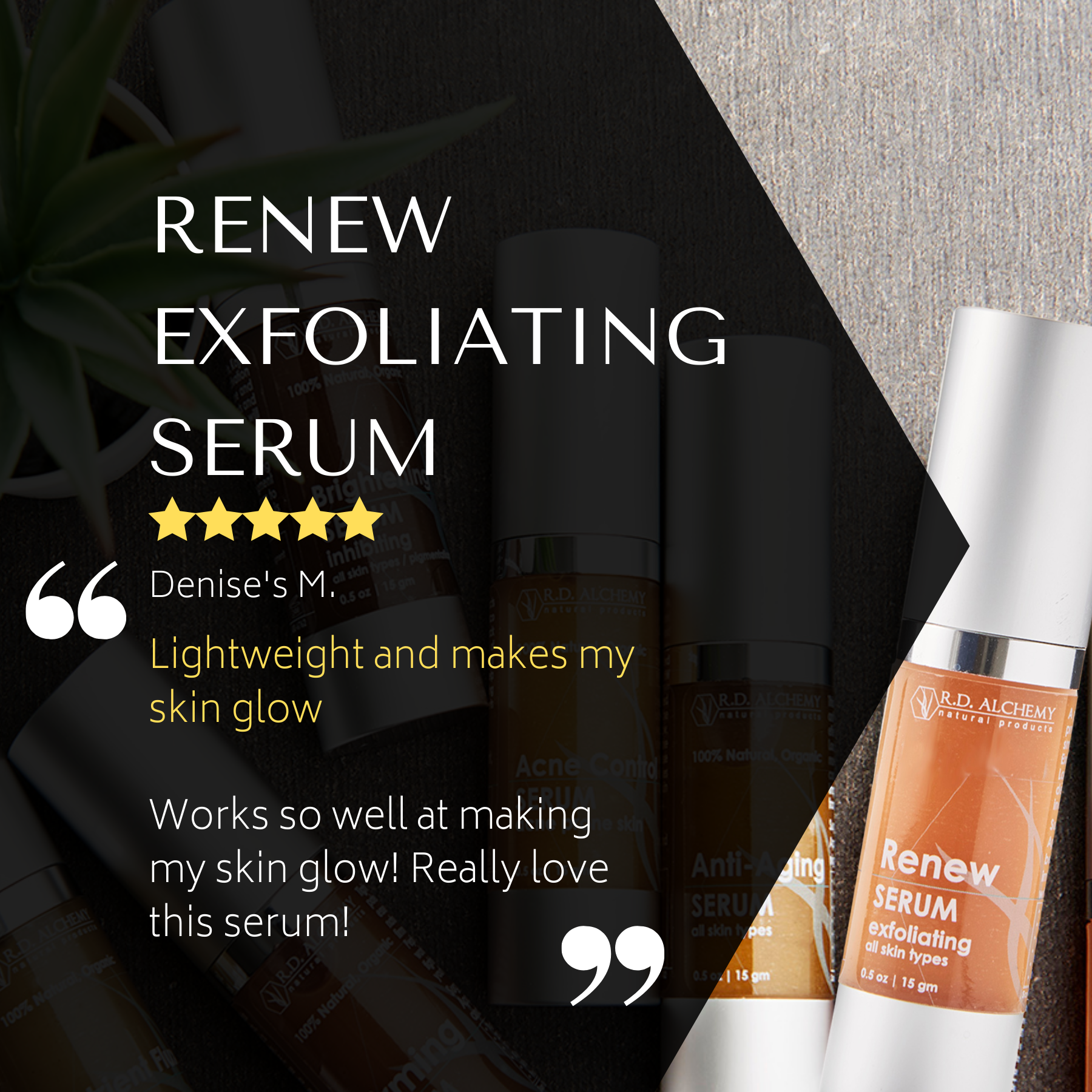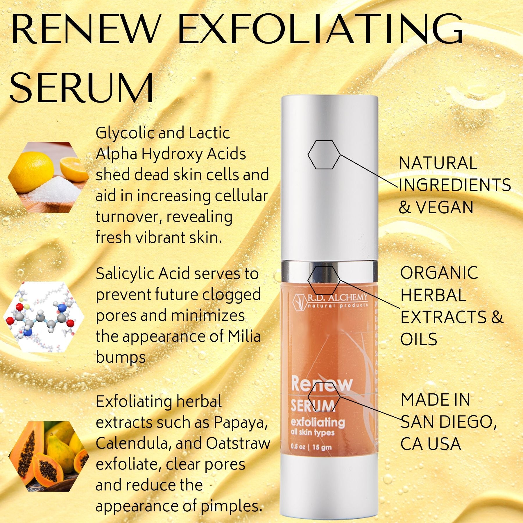 A powerful exfoliating gel serum for dull, Acne or Milia prone skin. Renewing and refreshing, it leaves the skin smoother, clearer, and more vibrant than before. Exfoliating herbal extracts, along with Glycolic and Lactic alpha Hydroxy Acids help to clear clogged pores and shed dead skin cells, revealing fresh new skin underneath and increasing cellular turnover. Salicylic Acid minimizes the appearance of Milia bumps that tend to accumulate around the cheek and eye area while keeping skin clear of excess cellular debris preventing clogged pores. Use a few times a week or daily as needed to reveal fresher, more vibrant skin and reduce the appearance of breakouts, Milia and renew a dull, ruddy complexion into a healthier more vibrant sheen.