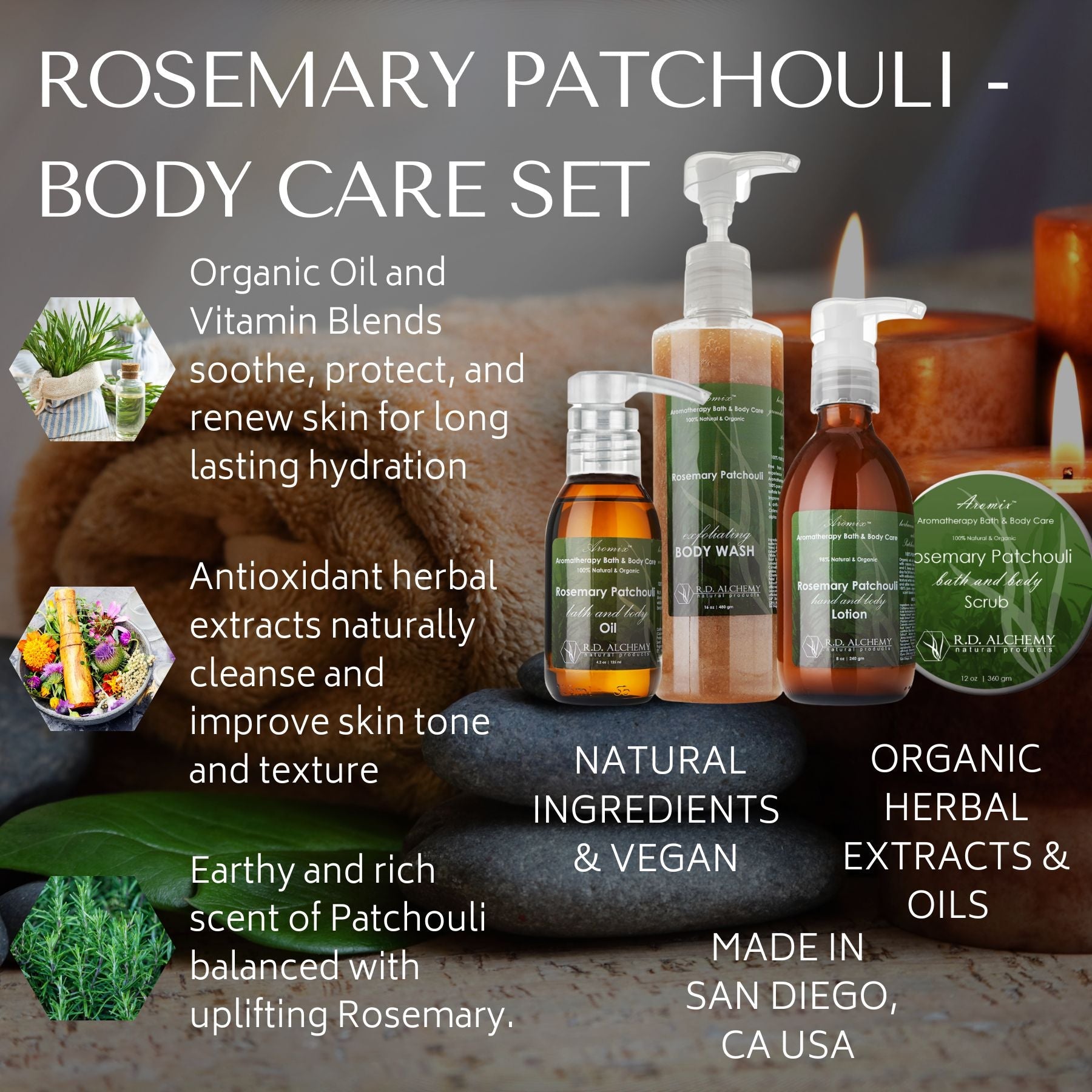 Slow down, take a breath and ease into your day or unwind into your night. Let the rich, earthy and grounding notes of woodsy Patchouli combined with herbaceous Rosemary aromatherapy essential oils leave you smelling fresh and feeling balanced and focused with this luxurious set.Experience the freshness as you gently cleanse with our Sulfate free Body Wash, exfoliate, dry, dull skin with our ultra-rich sea salt and oil Body Scrub, moisturizing Body Oil or creamy, yet lightweight Body Lotion.Make your daily beauty routine a truly luxurious, organic experience with natural aromatherapy rich bath and body care.
