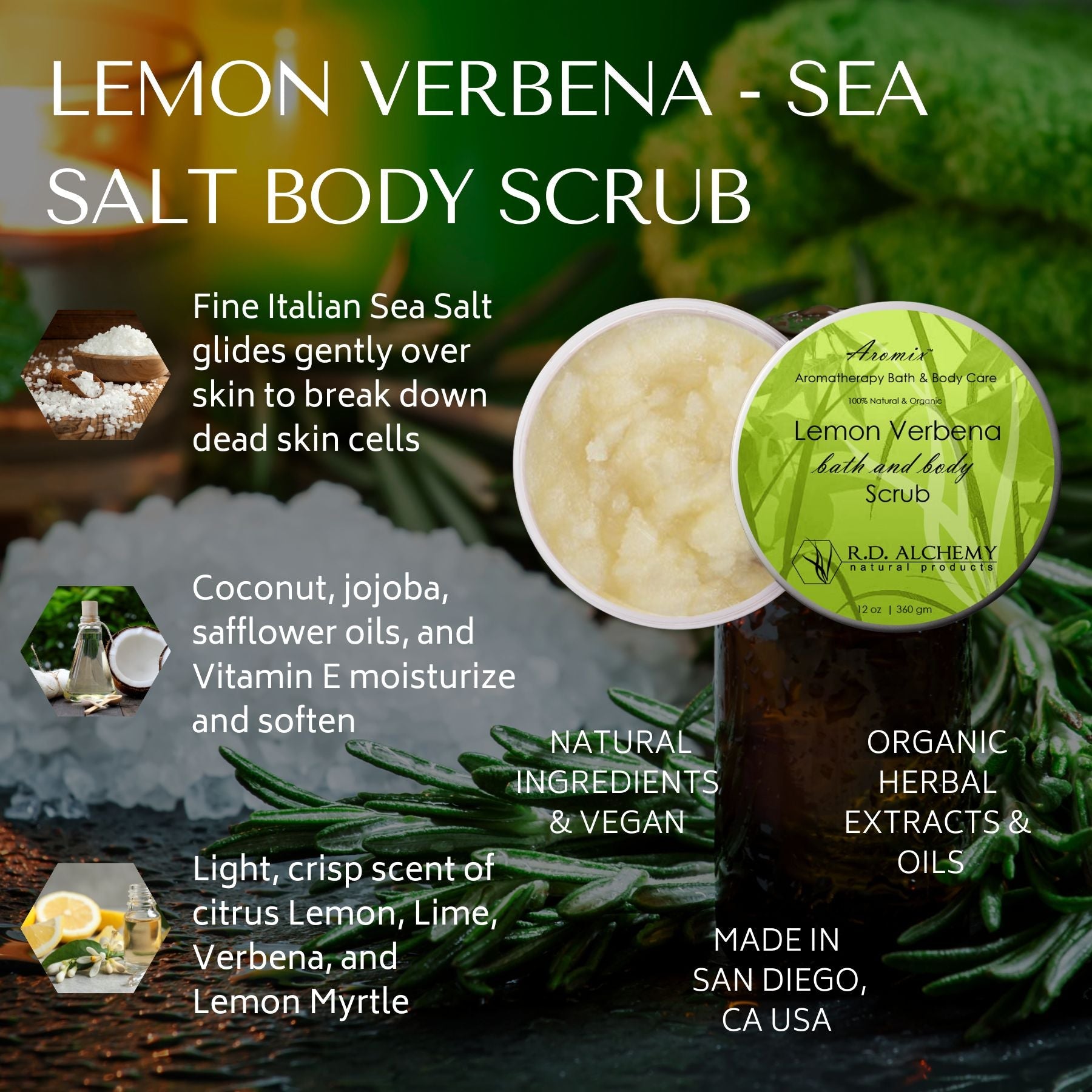 Fine Italian Sea Salt glides gently over skin to breakdown dead skin cells as Coconut, Jojoba, Safflower oils and Vitamin E moisturize and soften.