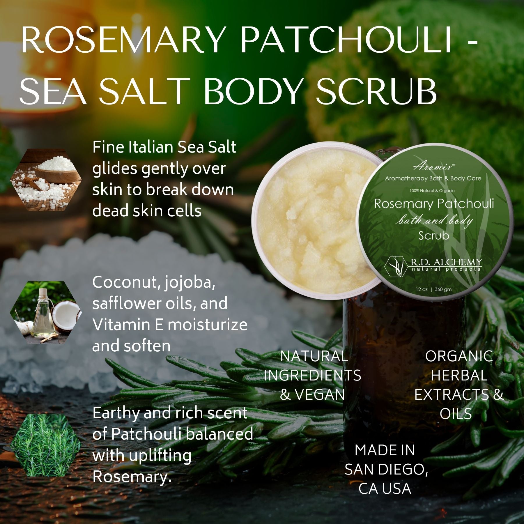 Slow down, take a breath and ease into your day or unwind into your night. Let the rich, earthy and grounding notes of woodsy Patchouli combined with herbaceous Rosemary aromatherapy essential oils leave you smelling fresh and feeling balanced and focused.A Sea Salt Body Scrub is something vital and not to be missed in your weekly routine! Weekly full body exfoliation helps reduce body acne, blackheads, stretch marks, flaky patches, ingrown hairs and pigmented blemishes. Transform the driest, dullest skin with our 100% natural, buttery salt scrub. Coconut, Jojoba and Safflower oils moisturize and soften, as 100% pure essential oils invigorate the senses & beautify while fine Sea Salt exfoliates dead skin cells to rejuvenate and renew.