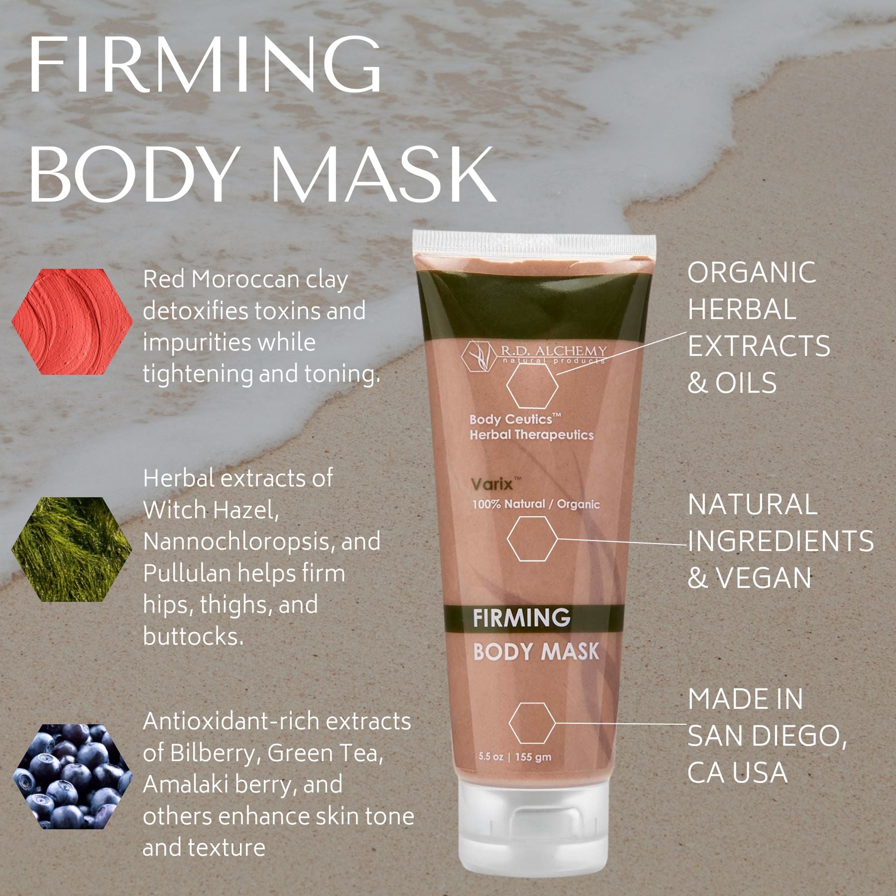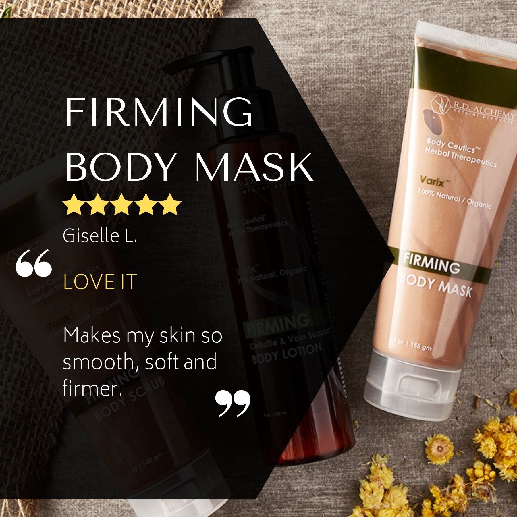 Apply a generous layer onto hips, thighs, and buttocks or over veins and let dry for 10-15 minutes or longer as desired. Rinse off and follow with our Varix Firming lotion. Repeat 1-3 times per week.*Tip - Apply this mask prior to your daily shower. Let it sit and dry while performing your other daily beauty duties, then jump in the shower and wash off! Follow with the lotion after showering.Use consistently and in combination with our Varix Firming Body Scrub and Varix Firming Body Lotion for best results. Initial results are seen within a few days and more intensely when using the 3-step system and when used consistently for 12 weeks or more. Once firming is achieved; continue to use a few times a week to help maintain firmness, soften and moisturize.For greater support with spider veins and varicose veins use in combination with our Vein Health Herbal Extract dietary supplements.
