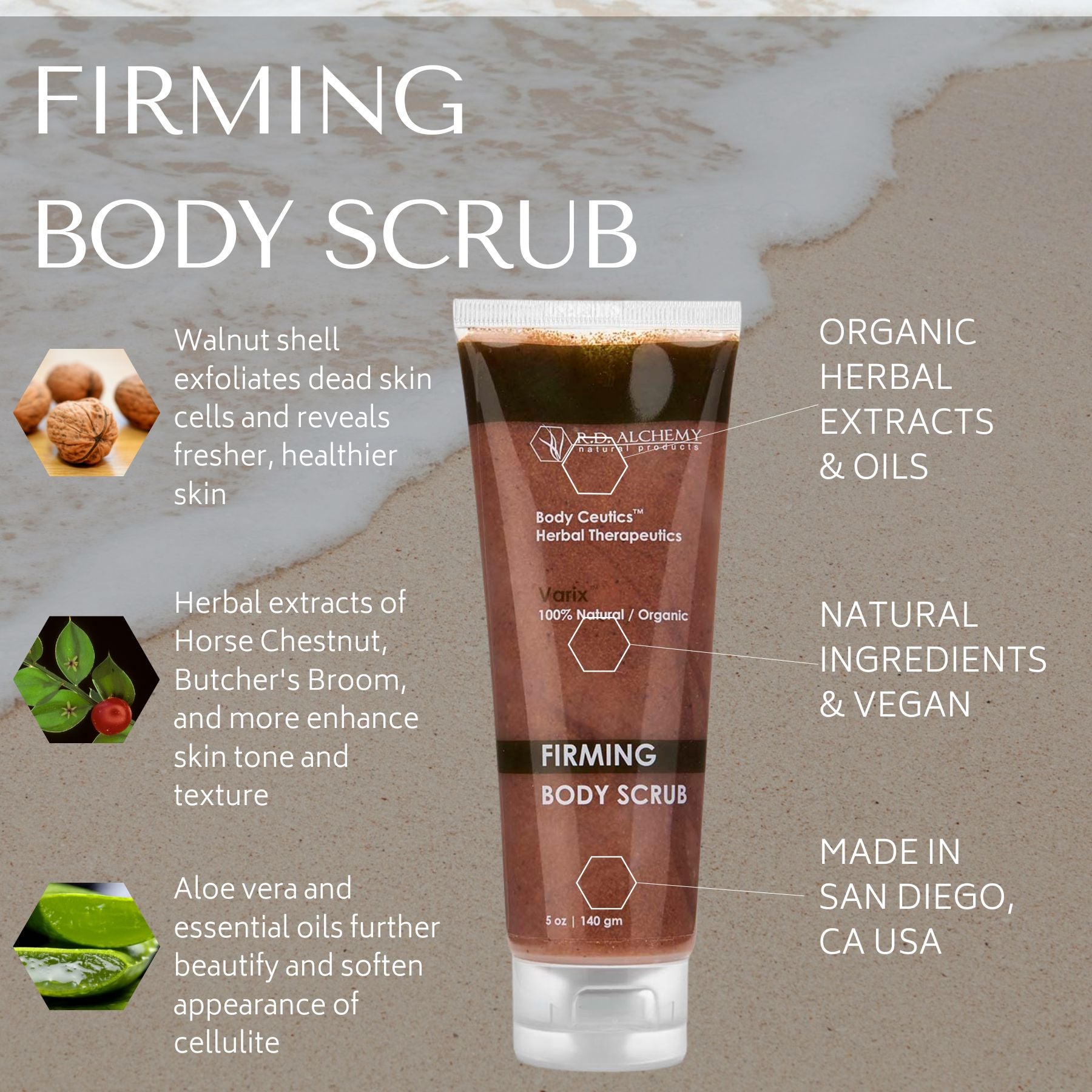 Horse Chestnut | Butcher's Broom | Witch Hazel | Gotu kola | Elderberry | Cleavers | Bilberry | Green Tea | Plantain | Juniper Berry | Ginkgo | Red Root | Ginger | Amalaki | Chili Pepper | Guarana | Garcinia | Aloe.Orange Essential Oil | Sage Essential Oil | Juniper Berry Essential Oil | Cypress Essential Oil | Walnut Shell.Herbal extracts, Walnut shell, Aloe vera, and essential oils exfoliate dry, dull skin to enhance skin tone and texture as they firm and tighten.